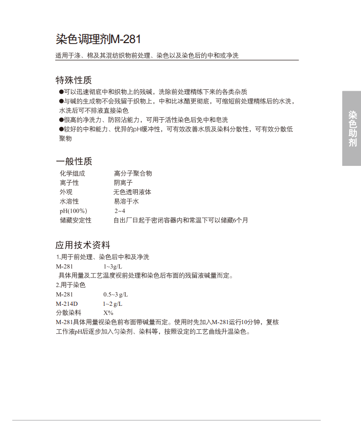 适用于涤、棉及其混纺织物前处理、染色及染色后中和或清洗。