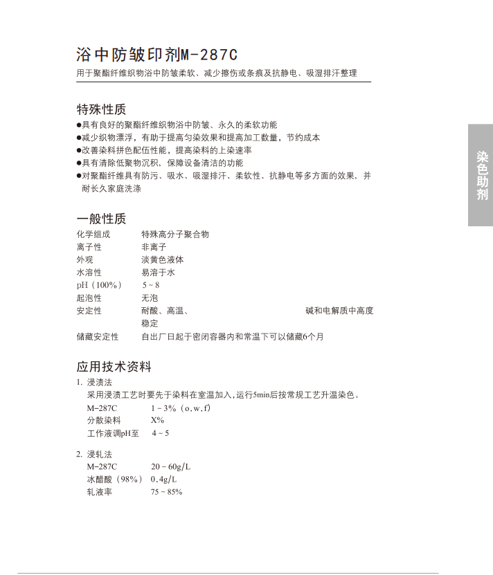 适用于聚酯纤维织物浴中防皱柔软、减少擦伤或条痕及抗静电、吸湿排汗 整理。