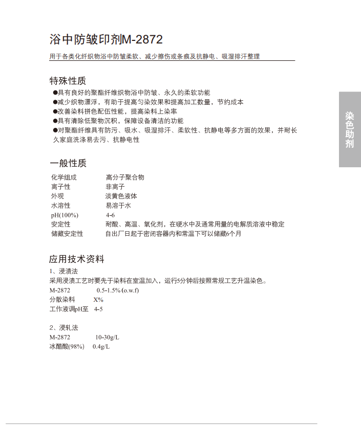 用于各类化纤织物浴中防皱柔软、减少擦伤或条痕及抗静电、吸湿排汗整理。