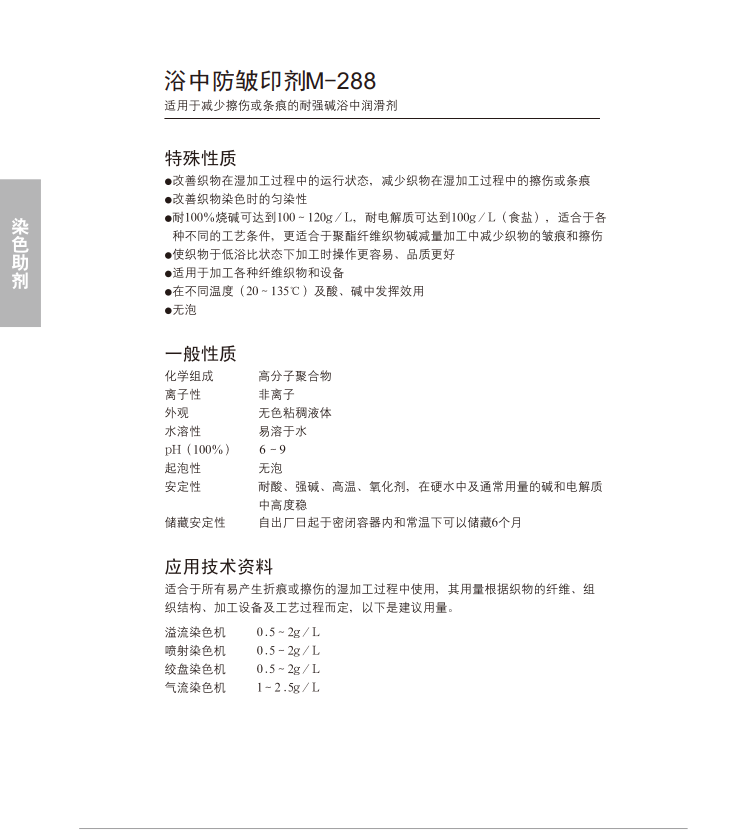 改善织物在湿加工过程中的 运行状态,减少织物在湿加工过程中的擦伤和条痕,改善织物染色时的匀染性;耐碱可达到100-120g/L(100%烧碱),耐电解质可达到100g/L(食盐);无泡。