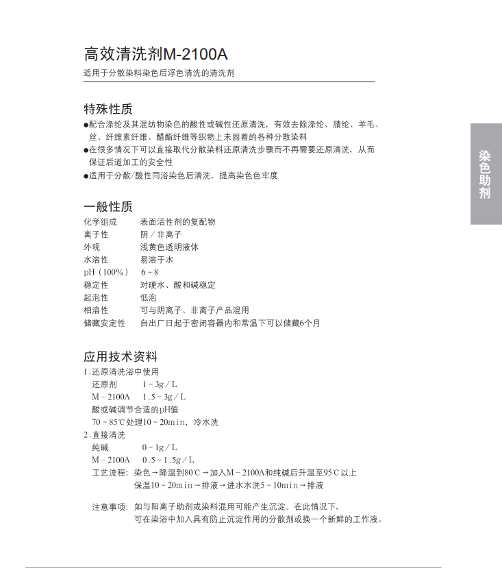 极优异的分散染料增溶分散净洗性能,可大幅提高染色牢度;可用于涤纶及其混纺织物同浴染色后清洗,也可搭配酸性或碱性还原清洗,提高还原清洗效果。