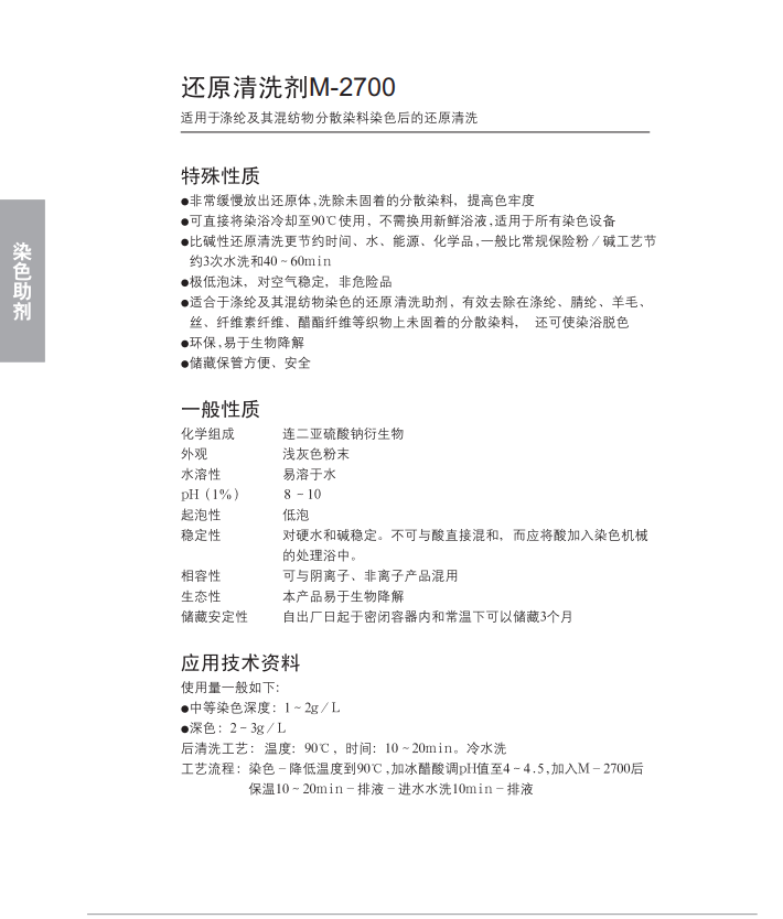 非常缓慢释放出还原体,洗除未固着分散染料,提高色牢度;比碱性还原清洗更节约时间、水、能耗。