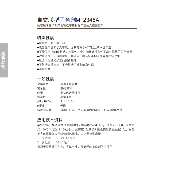 耐硬水、酸、碱、盐;pH值适用范围广,在酸性、中性、微碱性下均有优异的固色效果;对深兰、 翠兰、艳兰等均有优异的固色效果;适用于后丝光加工的固色处理;不影响日晒牢度,色变小。